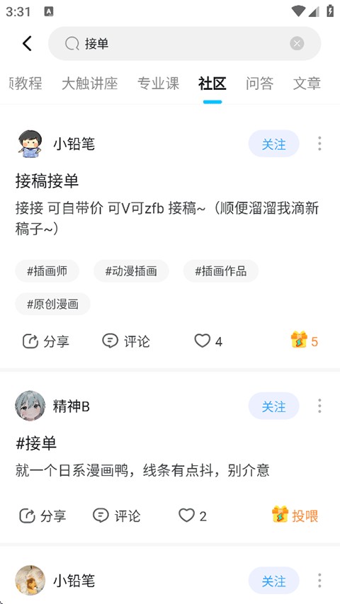 2、用户可以在社区中浏览搜索他人发布的找画师接稿动态;