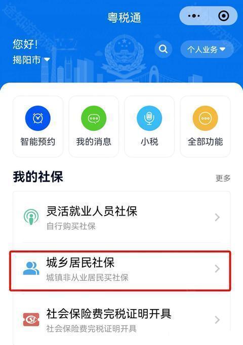 1、用户打开粤税通后,进入首页点击【城乡居民社保】