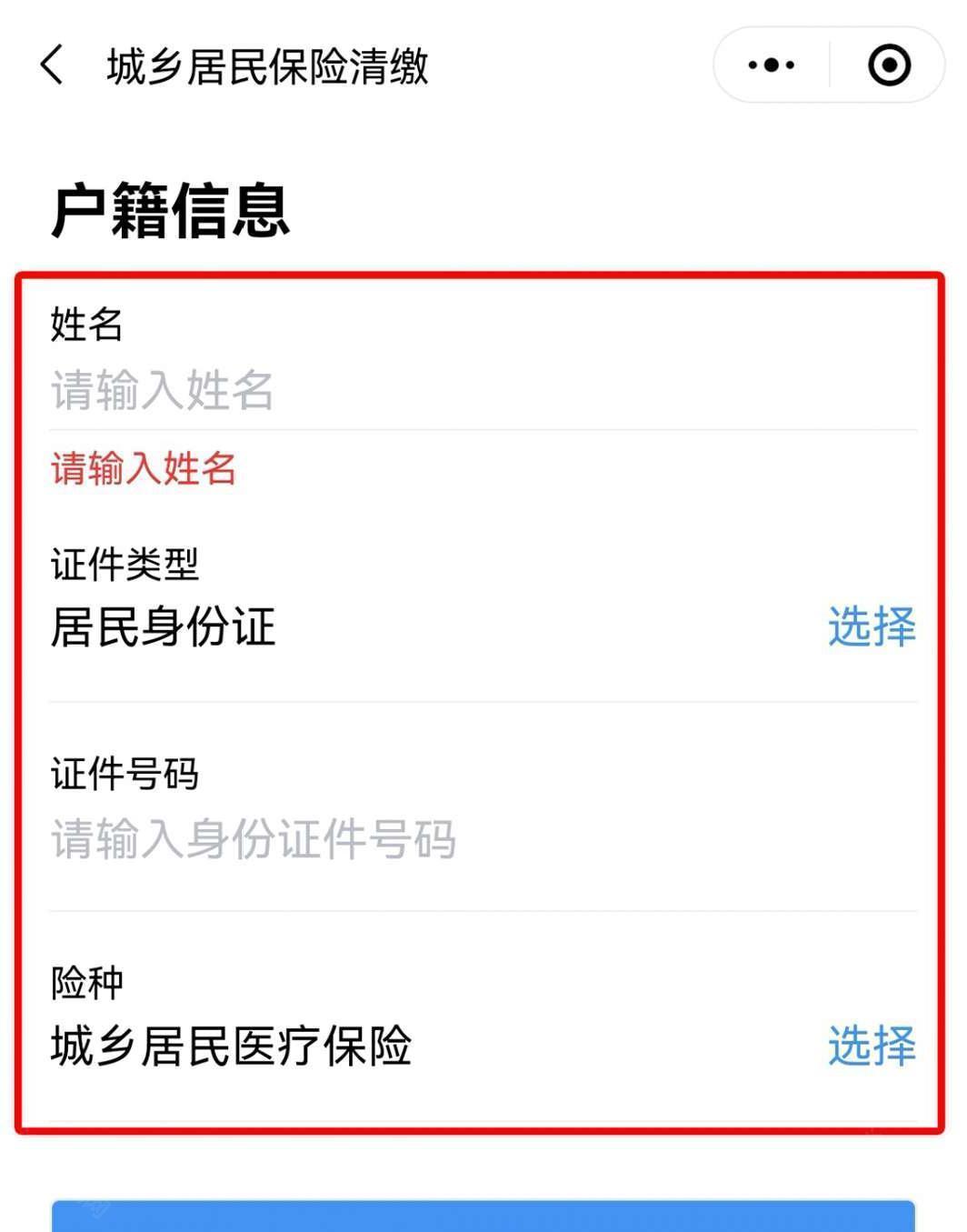 5、代他人缴费“险种”选择 “城乡居民医疗保险”,“缴费类型”选择“代他人缴费”,点击“下一步”进入“户籍信息”录入界面;