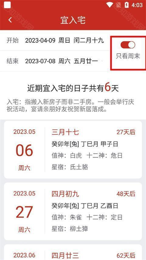 3、系统将自动列出近期适合入宅的吉日,你还可以开启“只看周末”选项,快速筛选出符合生活习惯的良辰吉日,方便安排重要事宜。