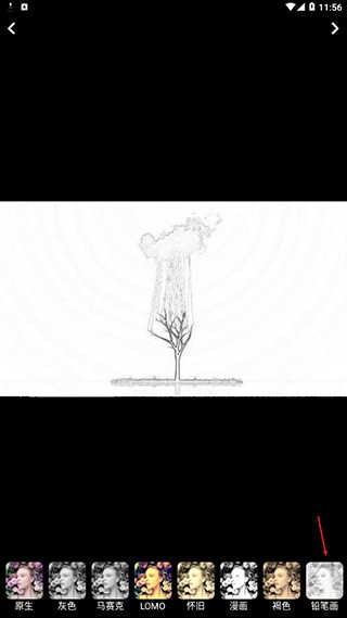 4、例如选择“铅笔画”滤镜,能瞬间赋予照片独特的艺术气息,当然你也可以根据个人喜好切换其他风格滤镜;