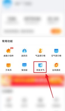 2、在“工具”页面“常用功能”下,点击“历史天气”。