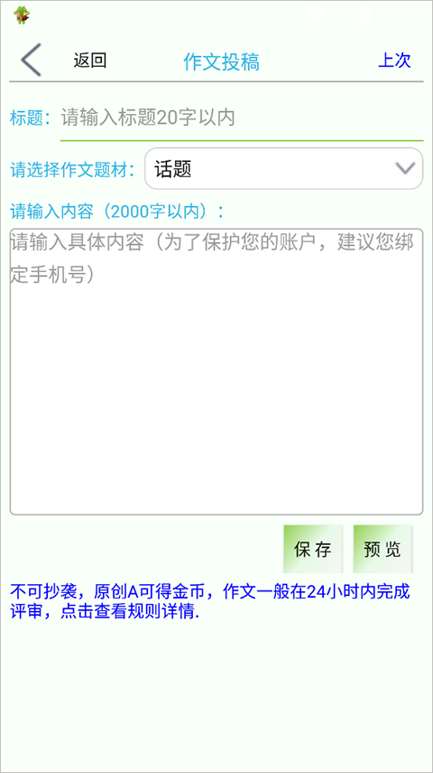 注:不可抄袭,原创A可得金币,作文一般在24小时内完成评审。
