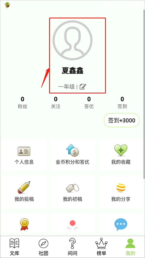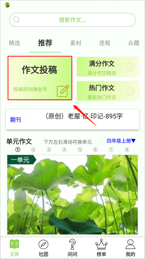 3、返回首页进入“文库”页面,点击“作文投稿”即可开始创作。