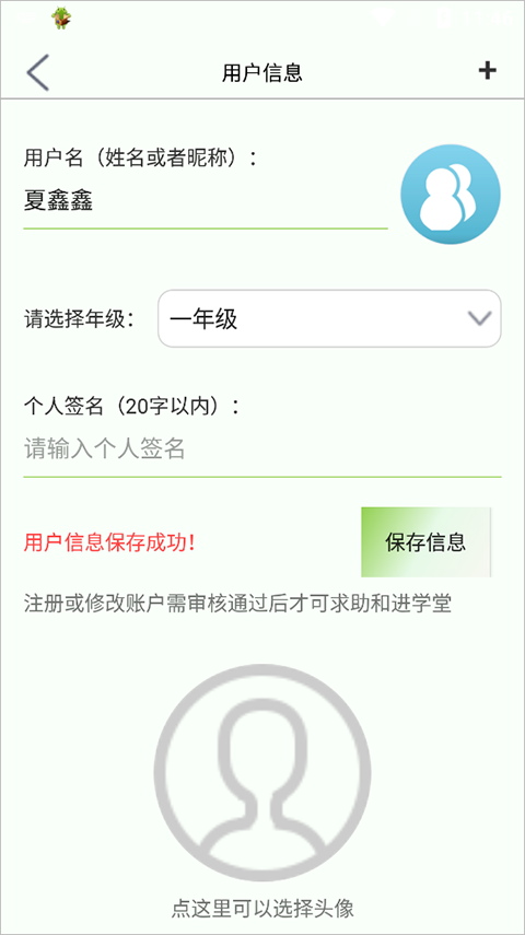 2、在“用户信息”中填写昵称、选择所在年级并上传头像,确认无误后点击“保存信息”。