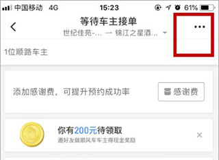 2、进入行程页面后可浏览当前顺路的司机列表,若无合适人选,可选择取消或重新发布行程。点击右上角三点图标按钮继续操作;