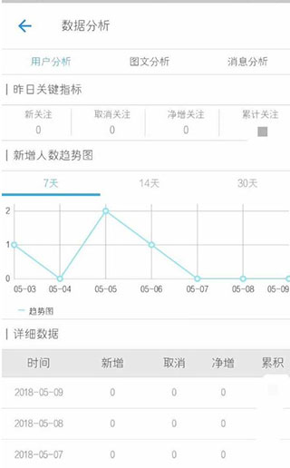 在“用户分析”页面,可清晰查看最近几天的新增关注、取消关注等用户行为数据。