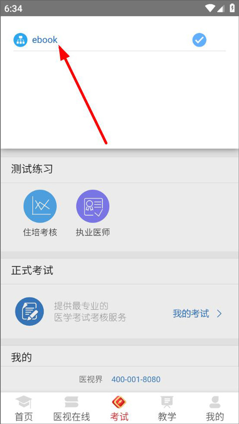 1、打开医学电子书包app,登录进入首页,首页有教材教程、手术操作、图书教辅、数字图书馆等功能,点击考试;