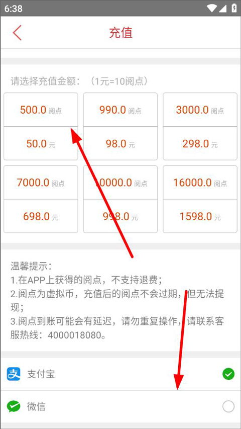 3、进入阅点充值页面,用户按需求选择阅点充值金额,选择支付方式支付即可获得阅点。