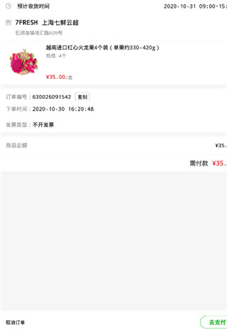 2、选择你附近的七鲜超市门店,系统会显示该店的营业时间与详细地址,确认信息无误后下单,即可按时到店取货。