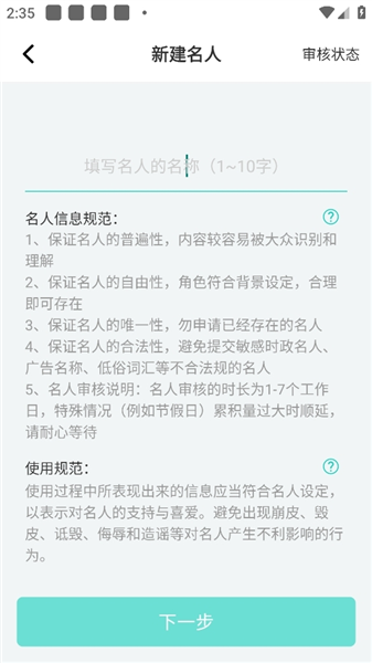 3、角色创建:右侧菜单进入新建流程,填写头像、姓名等基础信息,提交后查看审核状态(常规审核1个工作日)