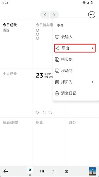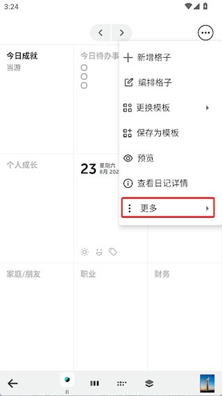 1、打开需要导出的日记,点击右下角的三点按钮,选择更多