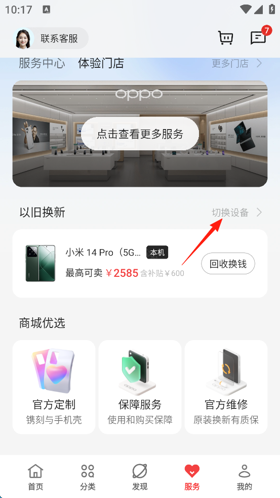3、在“以旧换新”右侧点击“切换设备”。