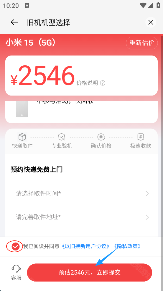 7、选择预约上门时间和上门地址,勾选“我已阅读...”,随后点击“提交”。
