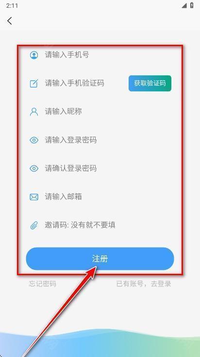 2.按照提示依次填写手机号、验证码、昵称、密码、确认密码及邮箱,完成后点击“注册”即可完成账号创建。