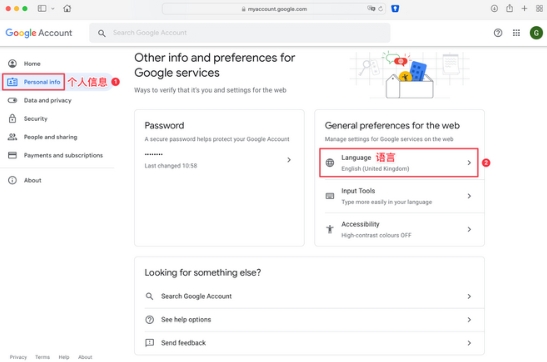 3、点击左侧“个人信息”选项,在右侧找到“Language”并修改为中文等所需语言。
