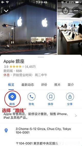 确认目的地详情后点击“路线”按钮,即可开启导航。详情页包含营业时间、联系电话、官方网站、用户照片及评分等实用信息,且大部分内容已自动翻译为中文,极大提升使用便利性。