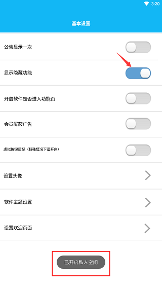 3、点击打开“显示隐藏功能”按钮,可以看到底部弹出提示“已开启私人空间”
