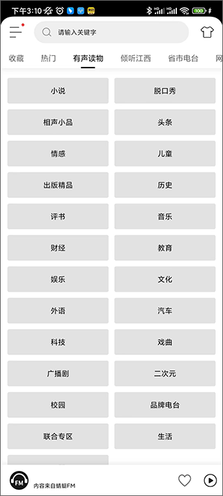 1、打开FM电台收音机app,点击搜索栏下方的“有声读物”入口