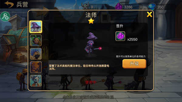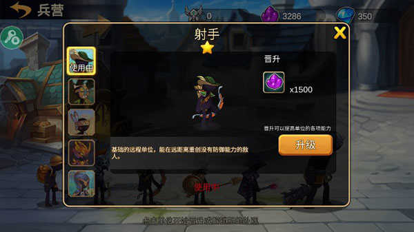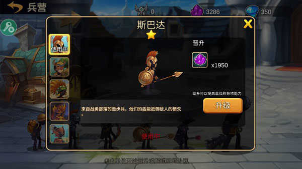 3.成功完成对敌军营的对抗外,玩家可前往军械库来使用技能点升级你的兵种,每个兵种的升级都能在基础的攻击力和防御力上更上一层楼