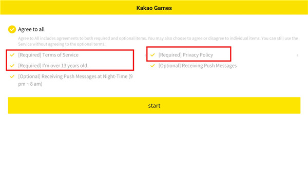 2. 首次进入需完成权限授权,其中标有【Required】的三项为强制同意项:《游戏须知》《年龄验证》《服务条款》,其余两项(消息推送、游戏通知)可根据个人偏好选择开启或关闭。