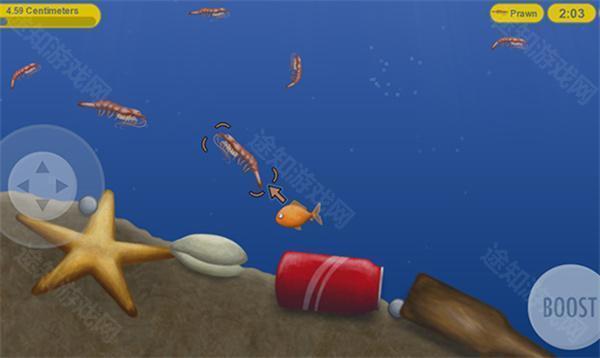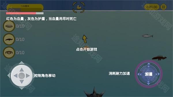 游戏采用虚拟摇杆控制,左侧区域操控小鱼移动,右侧为耐力加速按钮,点击即可短时提速,助你追击猎物或逃离危险。