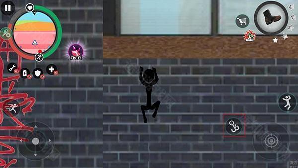 5、左侧摇杆控制移动,右侧钩子图标用于发射绳索实现空中摆荡,点击“人”形图标可跳跃,瞄准镜图标则触发攻击动作。