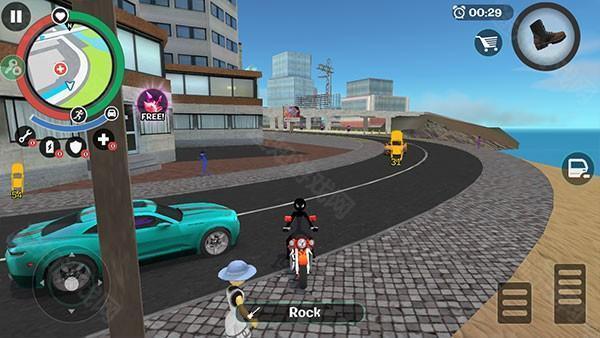 左侧虚拟摇杆控制角色移动与加速,右侧按钮分别对应绳索发射、攻击与跳跃功能,右上角则实时显示当前武器、血量及经验值。你可以自由选择战斗方式,与街头帮派展开激烈交火。击杀敌人不仅能积累经验,还会提升通缉星级,引来巡警甚至特种部队的围剿。如何在混乱中生存并完成任务,全靠你的策略与操作。