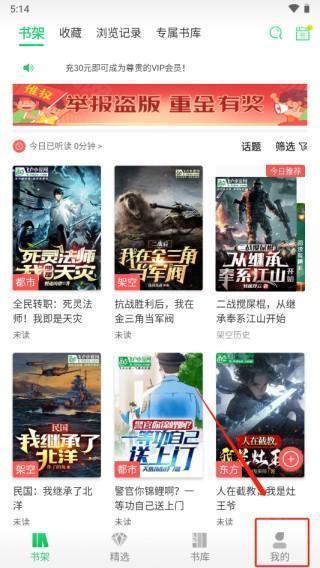 1、进入飞卢小说VIP永久免费版app,点击底部“我的”板块