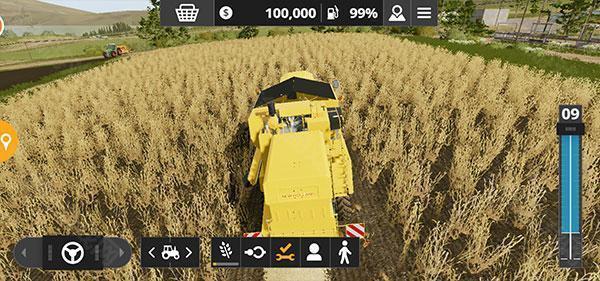 3、初始阶段你将拥有一块已成熟的小麦田,使用联合收割机进行收割。右侧滑动条控制油门(前进/后退),左侧方向盘控制转向。