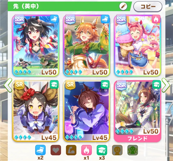 2、搭配2-3张A级以上SR卡,优先考虑比赛加成与技能折扣等级。
