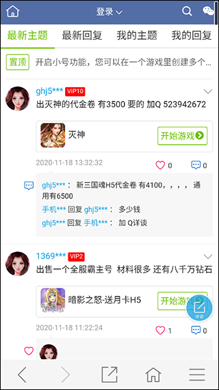 3、返回主界面,点击留言,可以看到各种有关游戏卖号或者资讯内容;