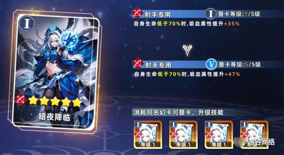 暗夜降临:生命值低于70%时,吸血效果提升47%。推荐搭配孙尚香,其具备极强爆发与额外行动回合,能最大化该卡收益。