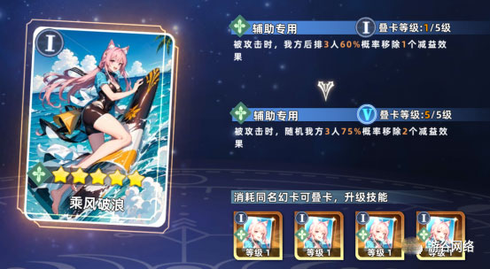 乘风破浪:受到攻击时,随机为我方三名角色以75%概率清除两个减益状态。桃乐自身也拥有解控能力,搭配此卡可进一步强化团队容错率。