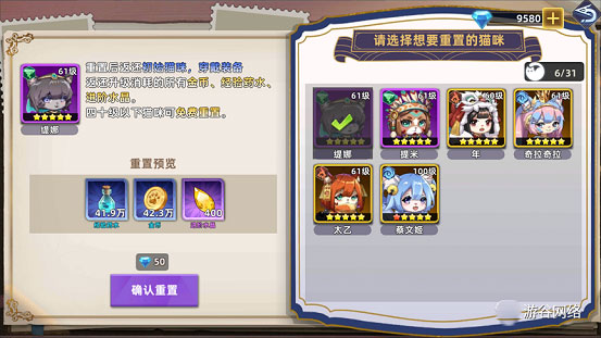 40级以下的猫咪重生可全额返还所有投入资源;40级以上则仅需50钻石即可完成重生,实现零损耗换将,极大提升阵容调整灵活性。