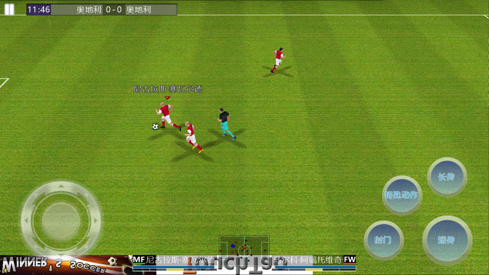 分别为短传、长传、射门、特殊带球键。注意,方向圆盘内圈为正常速度奔跑,外圈为加速跑。