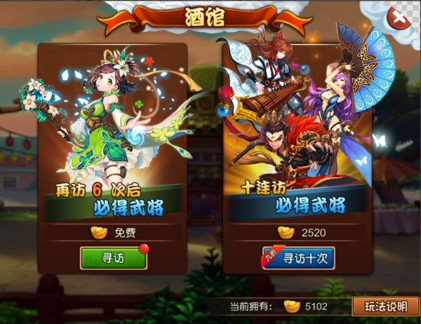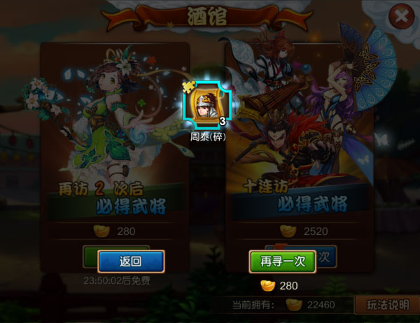如图所示,酒馆抽将分为单抽和十连抽两种方式。单抽获得武将的概率较低,但每天可免费抽取一次;十连抽则必定获得至少一名武将,需消耗元宝进行。接下来,我们就详细聊聊如何高效抽将。