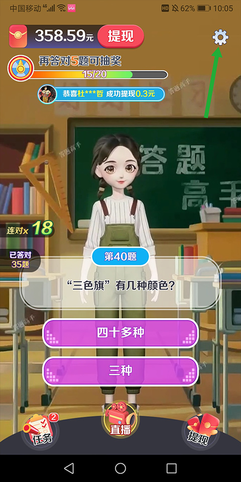 1、进入亿万答题王主页面后点击右上角的【设置】小图标(下图绿色箭头所指)