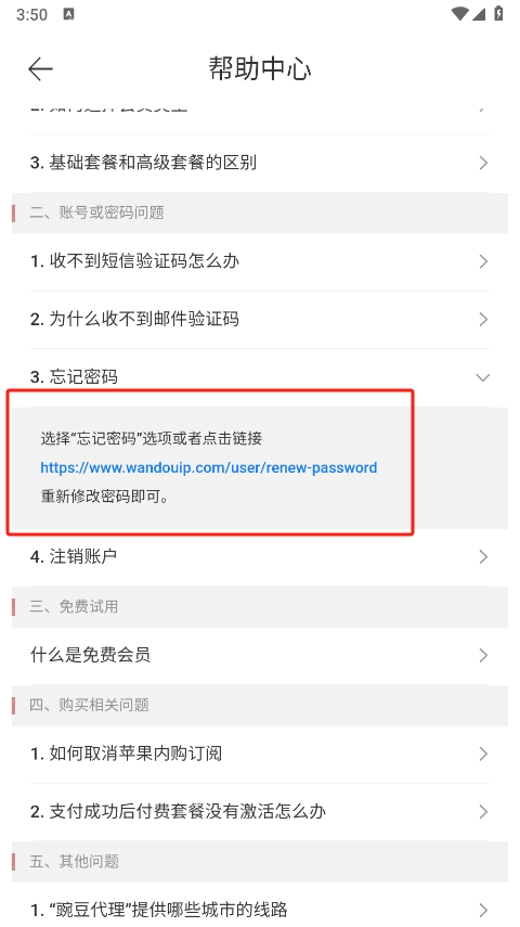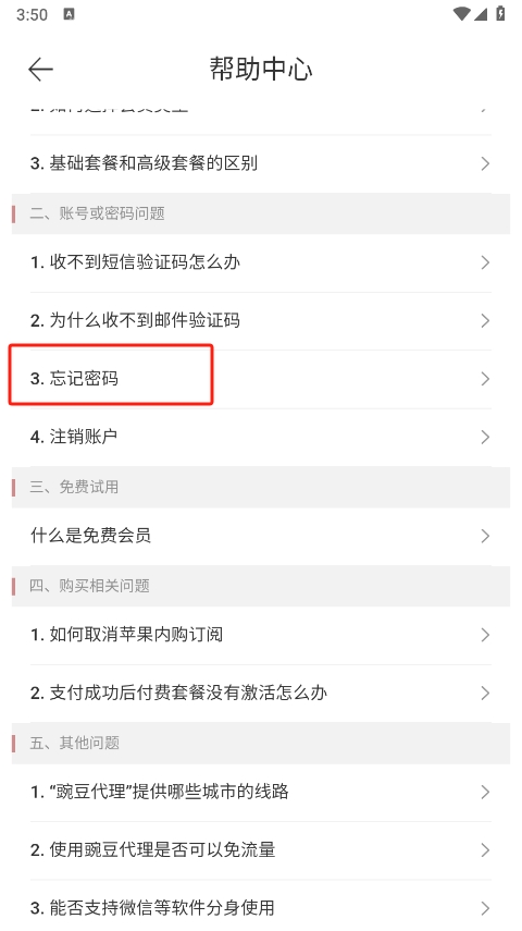 2、进入帮助中心页面,这里汇集了常见问题解答,其中“忘记密码”功能是用户经常需要用到的服务。