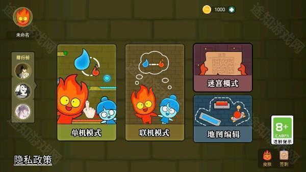 打开森林冰火人双人游戏联机版后,首先选择你想要体验的游戏模式,包括单人、本地双人或在线联机。