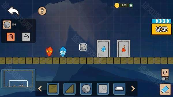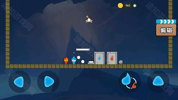 关卡中遍布各类互动道具,例如一块巨石,需由火娃娃将其推落,为冰娃娃搭建跳跃平台,实现路径贯通。