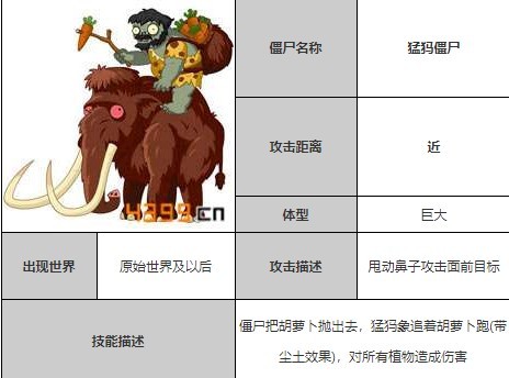 8、猛犸僵尸体型庞大,防御极高,其冲锋技能可对全体植物造成范围伤害,是团队协作防守的重点目标。