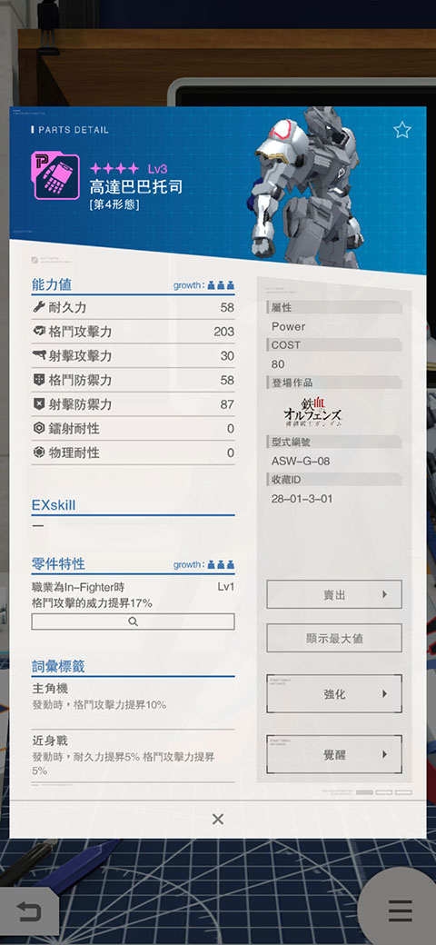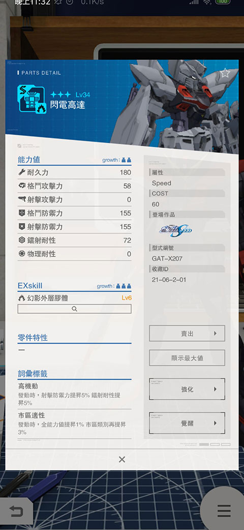 1、启动高达破坏者手游后,默认机体为高达巴巴托司,该机体擅长近身作战,火力强劲,格斗加成高达10%,其余属性加成为5%,