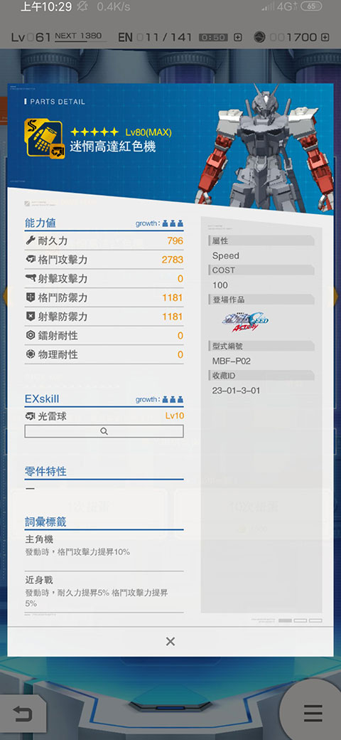 4、如图所示,装备红异端手臂的是迷惘高达红色机,其专属必杀为“雷切”光雷球,格斗属性略低于能天使与巴巴托斯。游戏中还有众多不同特性的高达机体可供选择,灵活搭配将助你制霸战场。