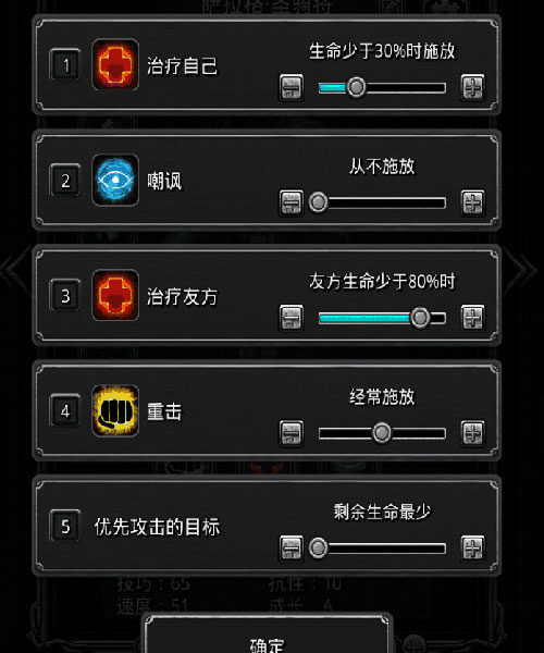 6、战斗默认自动进行,但可手动取消自动模式以精细操控。此外,出征前可为佣兵预设战斗策略,例如设定圣骑士在队伍血量低于80%时自动治疗,从而维持整体生存能力。