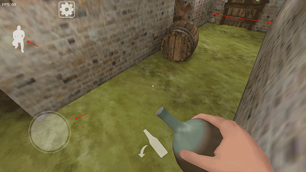 2、通过滑动屏幕上的虚拟摇杆控制角色移动,点击左上角的“人物”图标可让角色下蹲,便于躲避敌人或穿过低矮障碍。