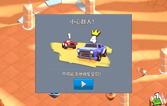 车辆会自动前进,你只需通过点击屏幕左右控制转向。重点在于高效收集皇冠徽章,同时避免过早卷入混战。因为一旦被击毁,你所携带的皇冠会掉落至死亡点附近,可能被他人捡走。因此,初期可采取“绕边发育”策略,在边缘区域积累资源,待装备成型后再加入主战场。