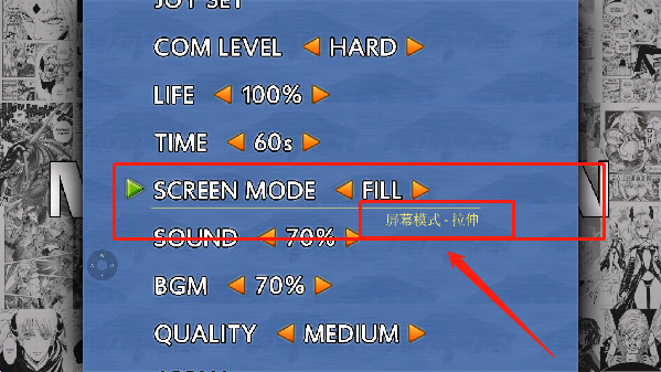 1、进入游戏设置,找到屏幕模式,将其设置为“拉伸”即可达成全屏的显示效果