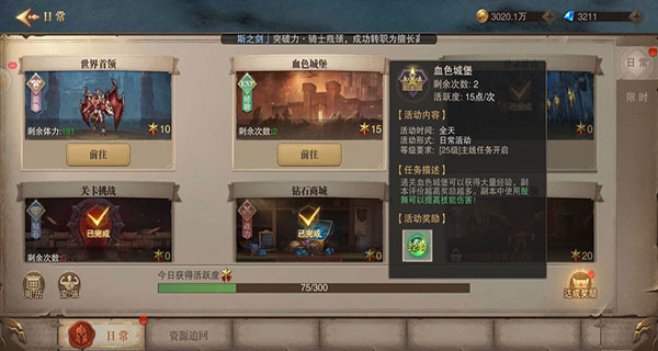 血色城堡是首个开放的经验副本,每日可进入3次。副本评价越高,获得经验越多,建议使用鼓舞道具提升伤害以争取更高评分。