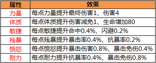 在“王者觉醒”版本更新后,角色装备界面新增六大属性:力量、残暴、愤怒、敏捷、耐力、体质。这些属性直接影响角色的战斗表现,具体效果如下图所示。